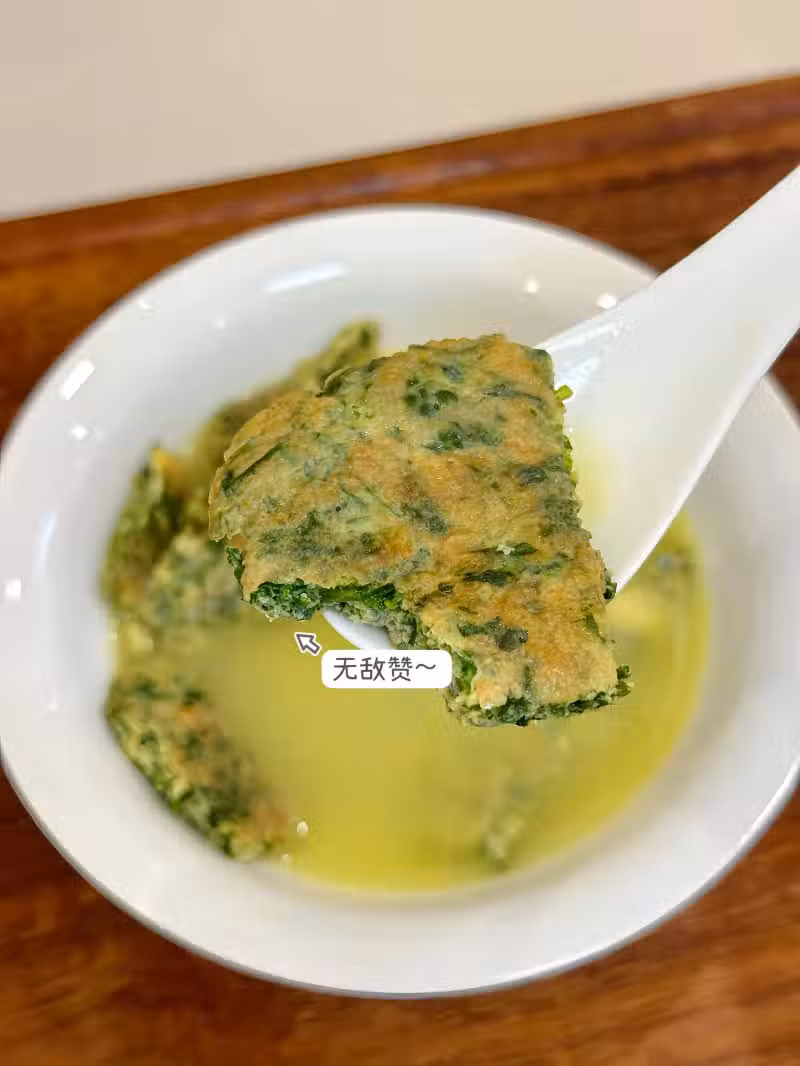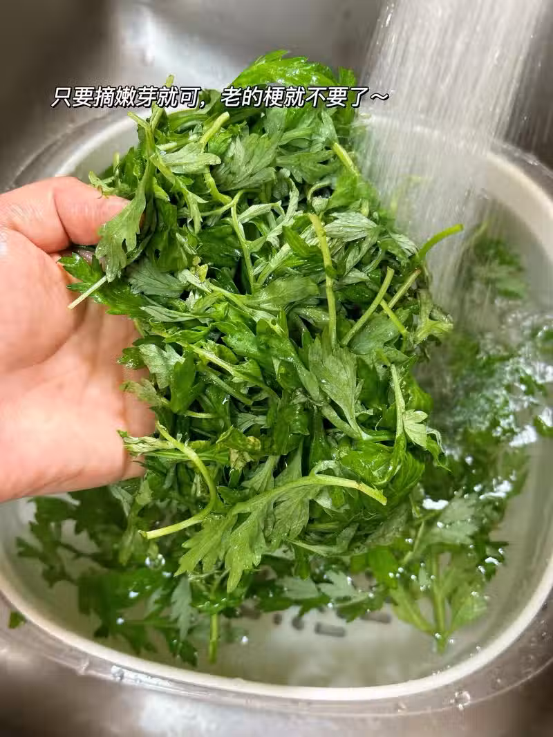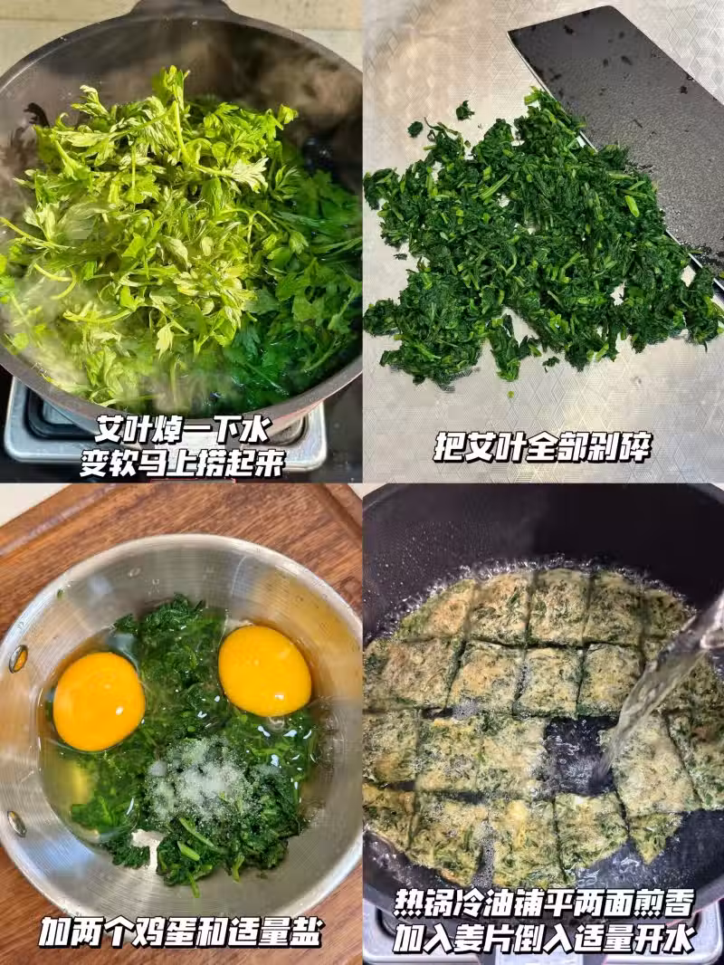 》艾葉焯一下水,變軟馬上撈起來把水分抓干,把艾葉剁碎,加入兩個雞蛋和適量鹽花攪拌均勻,熱鍋冷油鋪平鍋中,兩面煎至金黃,加入薑片和適量開水,中火滾10-15分鐘即可~