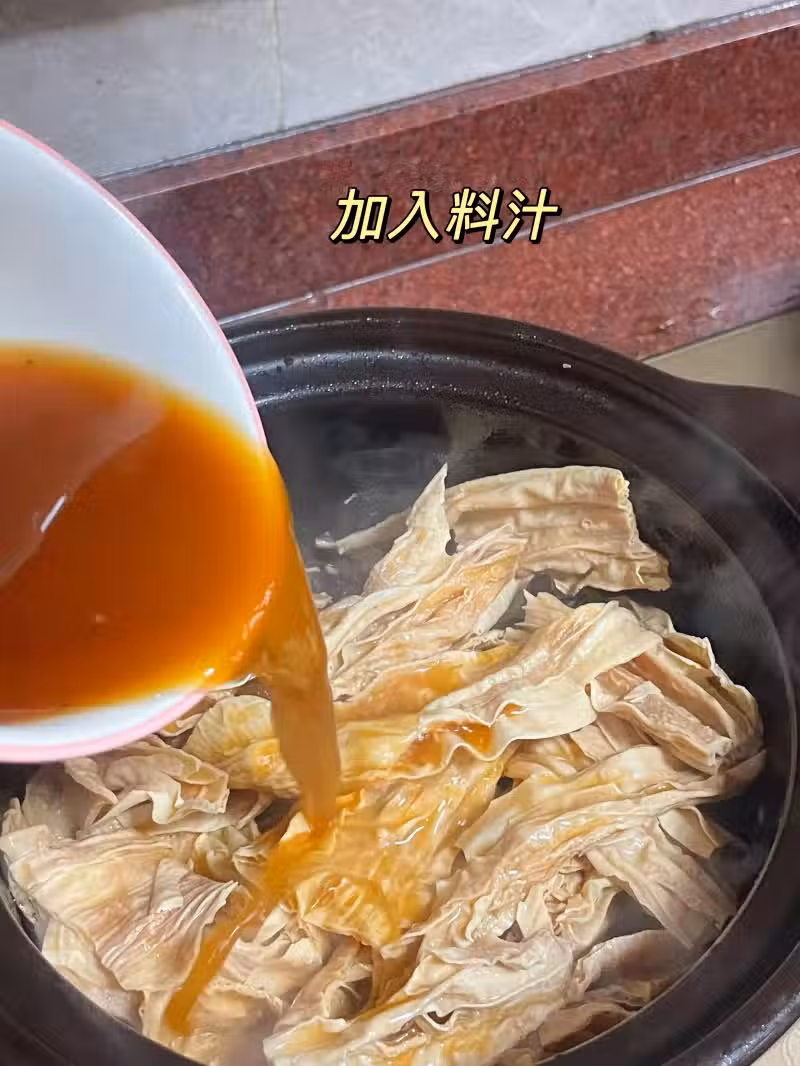 - 倒入調好的料汁,中火煮3分鐘,讓腐竹吸飽湯汁。