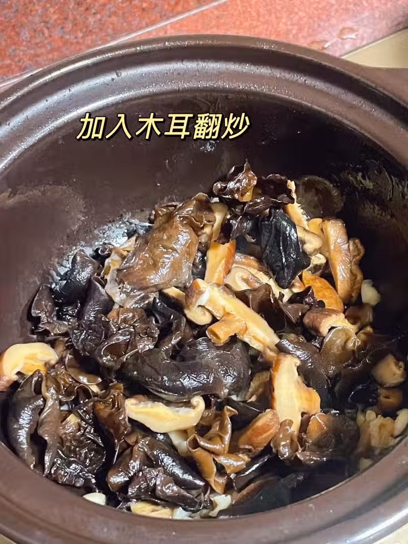 - 加入木耳翻炒1分鐘,再放腐竹輕翻(避免腐竹斷裂)。