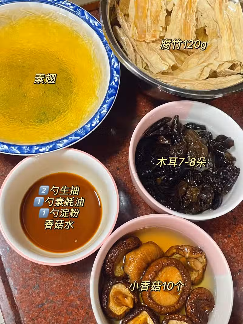 核心三寶:腐竹(豆香濃郁)、木耳(脆滑)、香菇(鮮香)