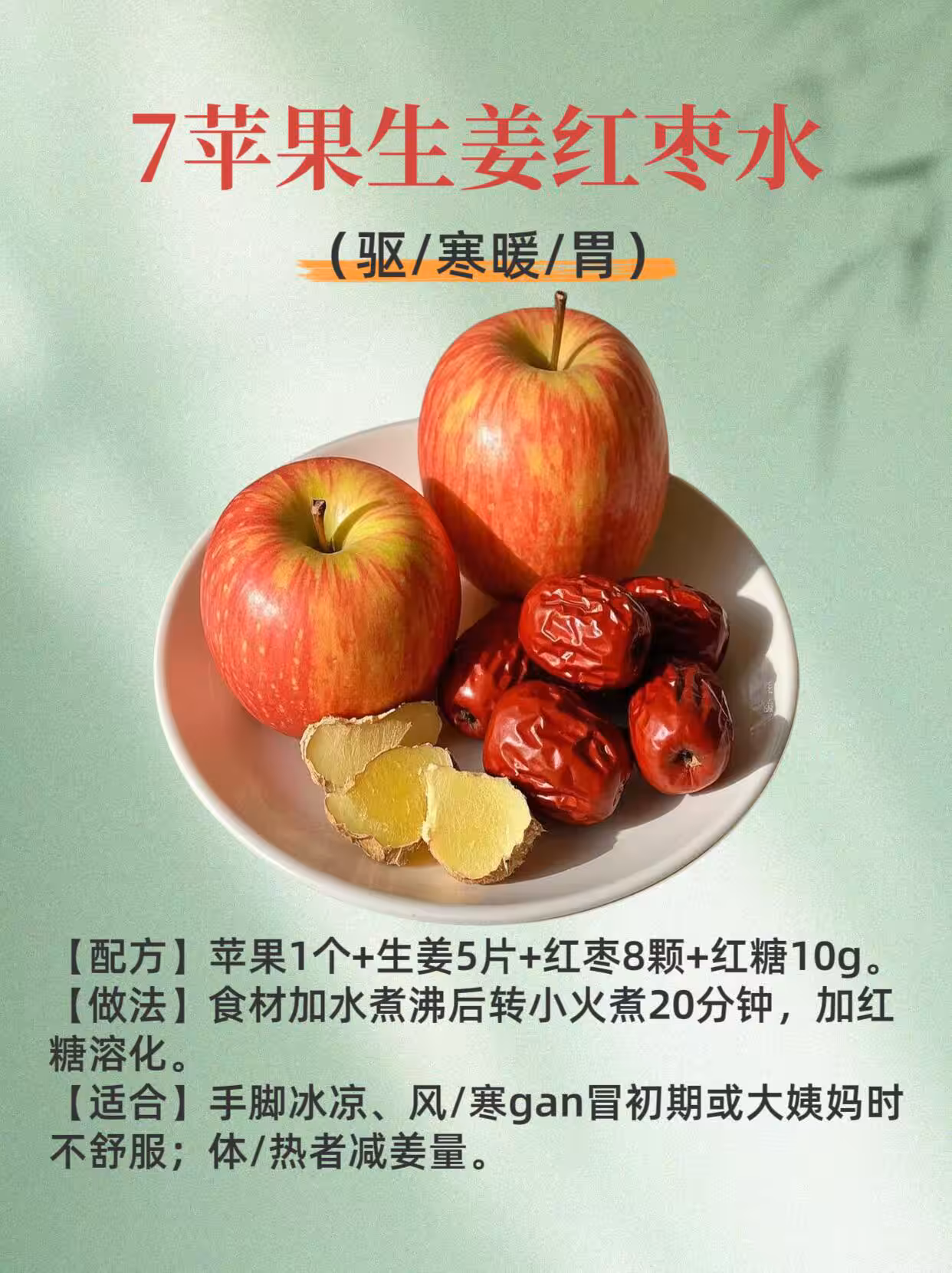 🍯 蘋果生薑紅棗水:蘋果1個+生薑5片+紅棗8顆+紅糖10g。所有食材煮20分鐘,加紅糖。