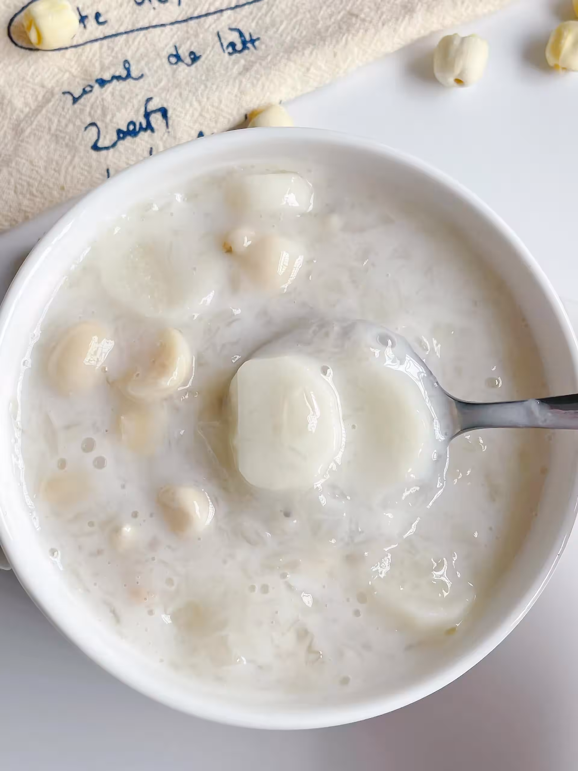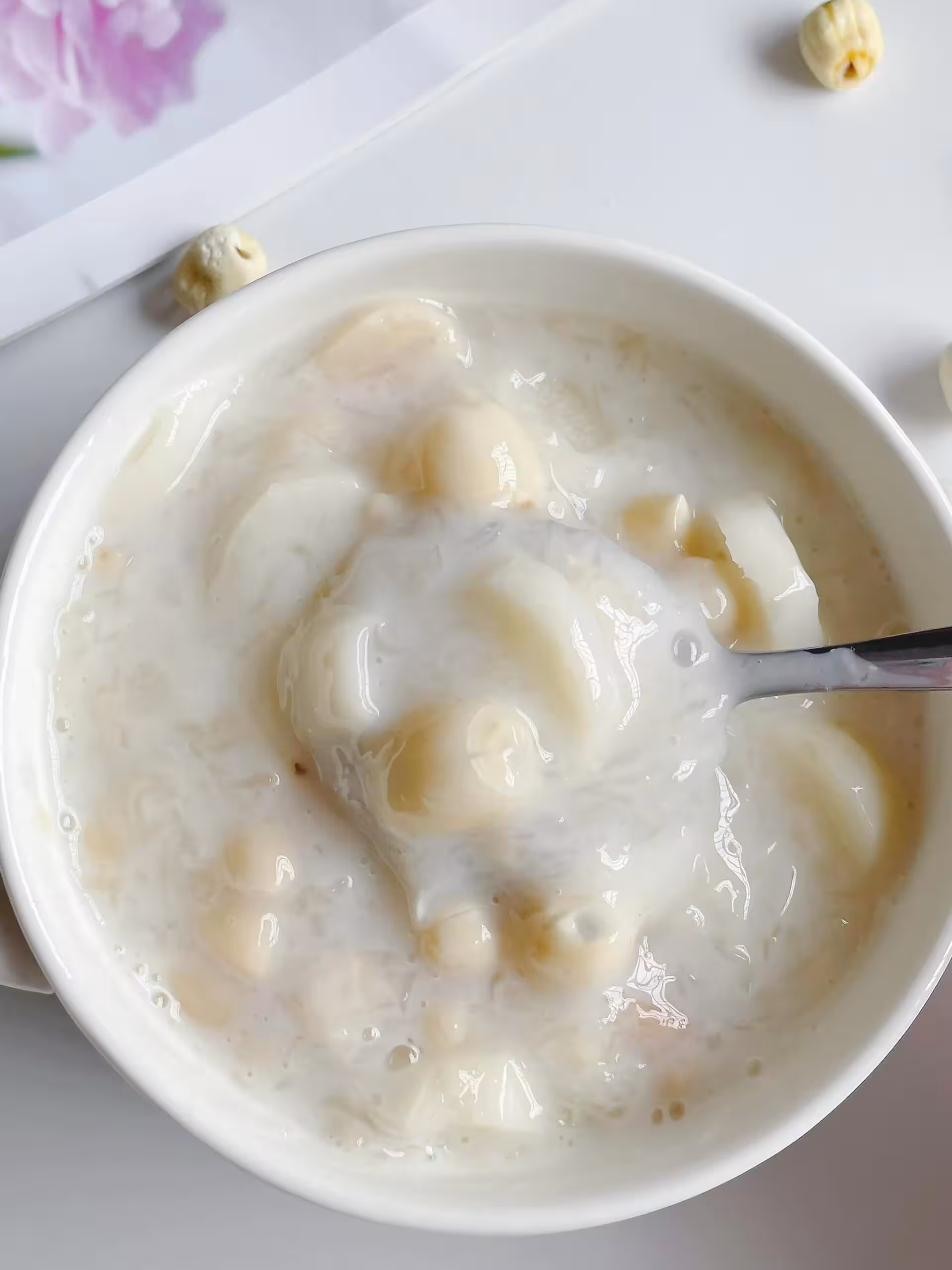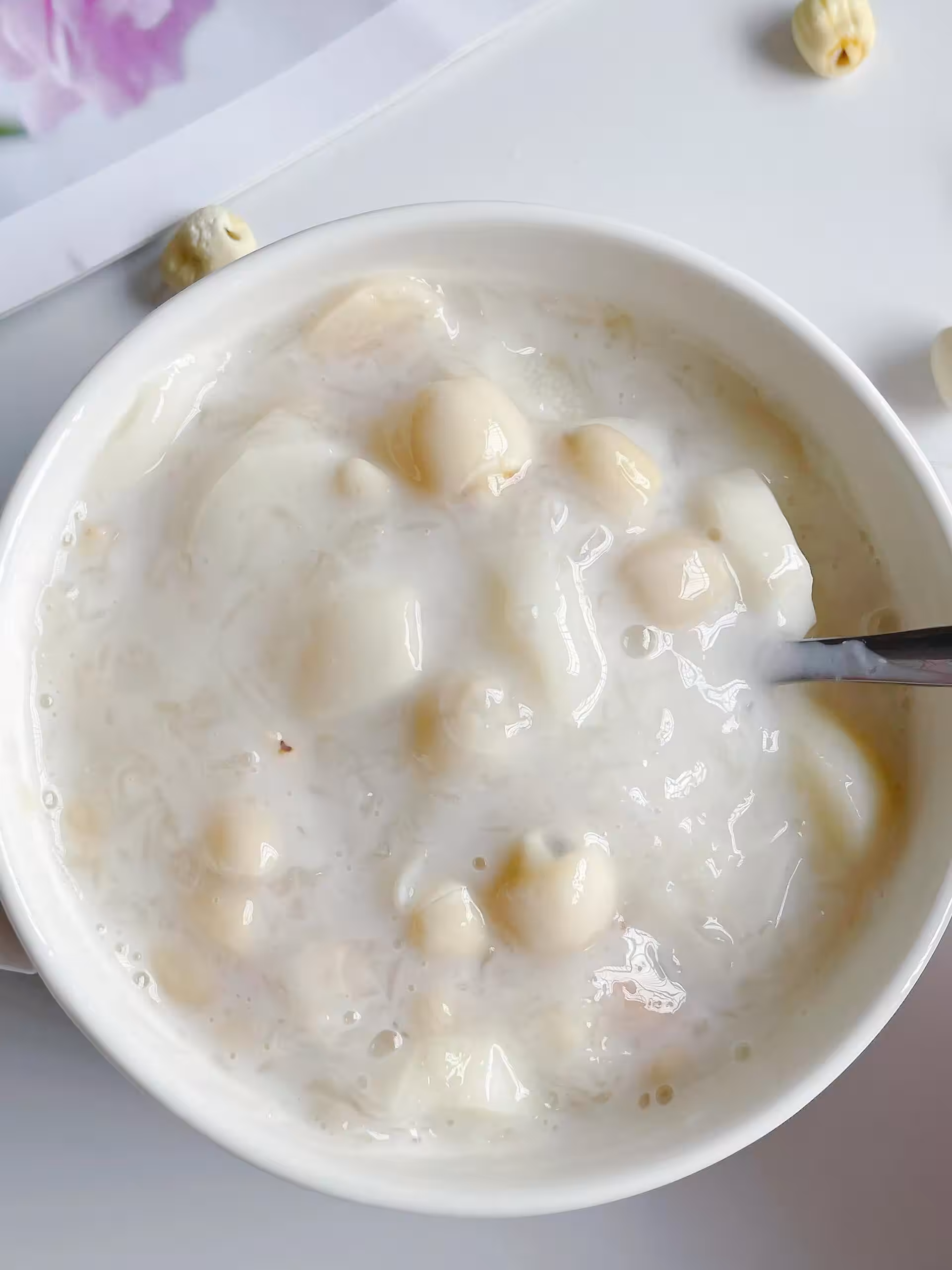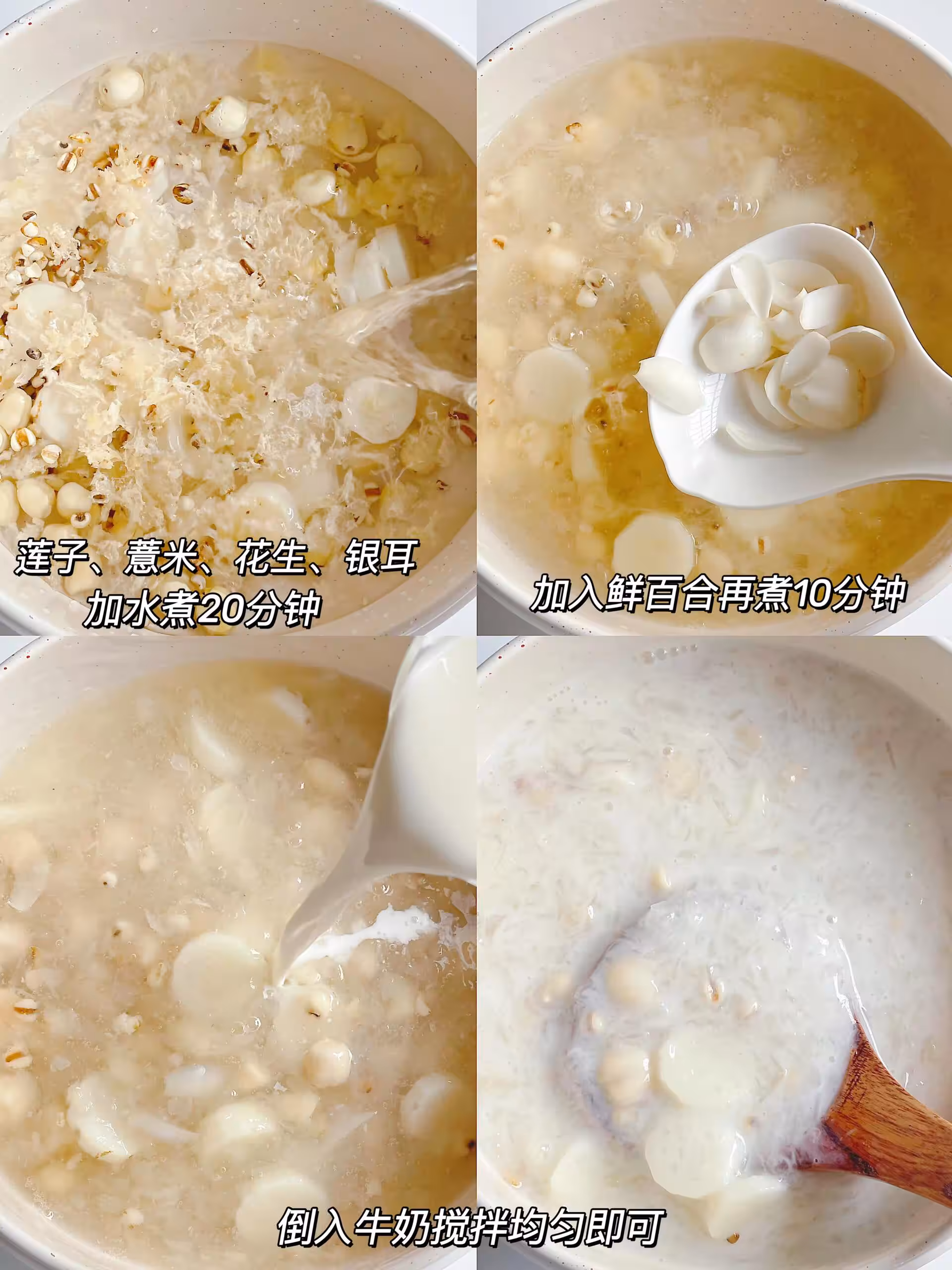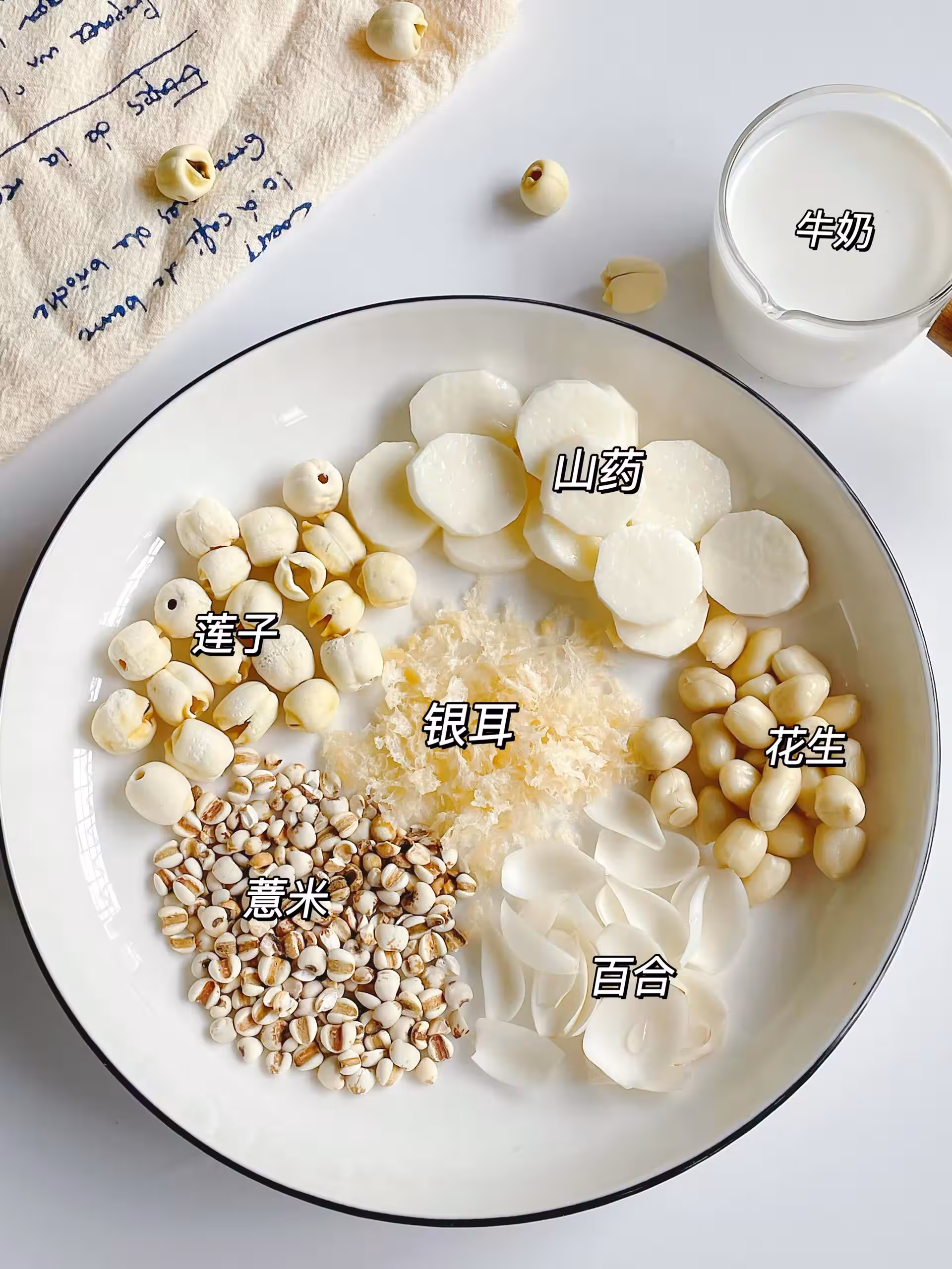蓮子、花生、山藥、百合、薏米、銀耳,牛奶