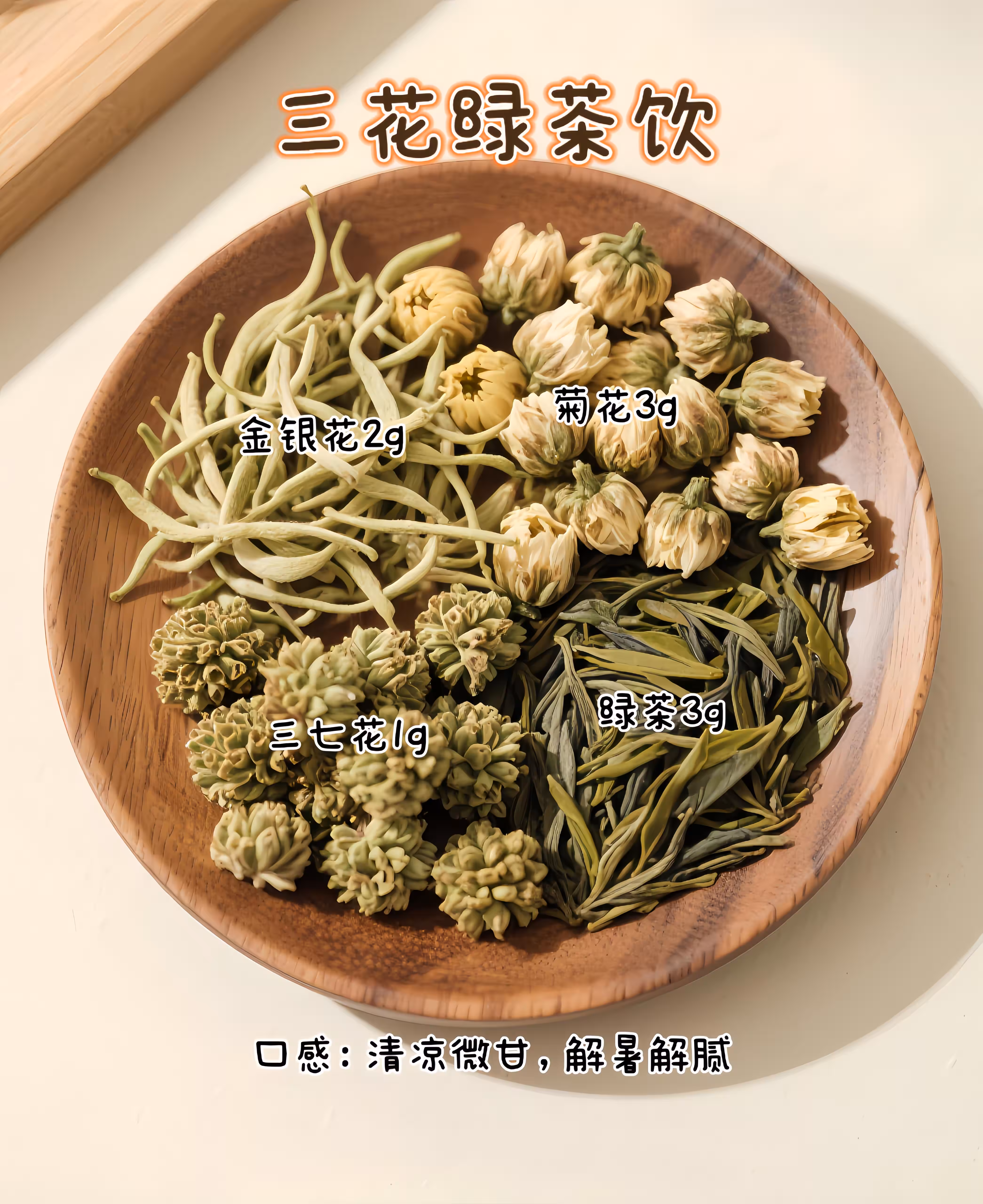 材料:菊花3朵+金銀花2g+綠茶3g +三七花1g