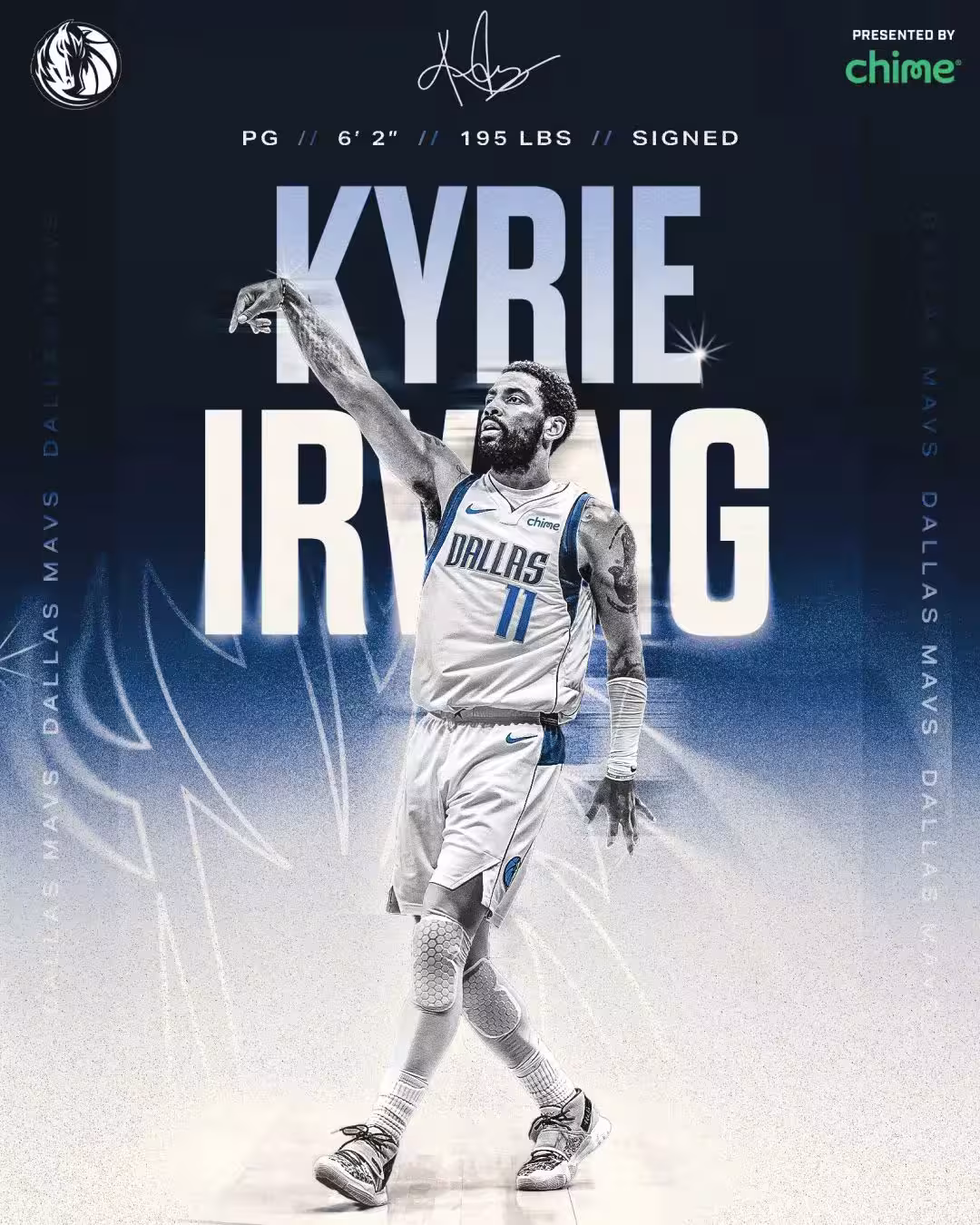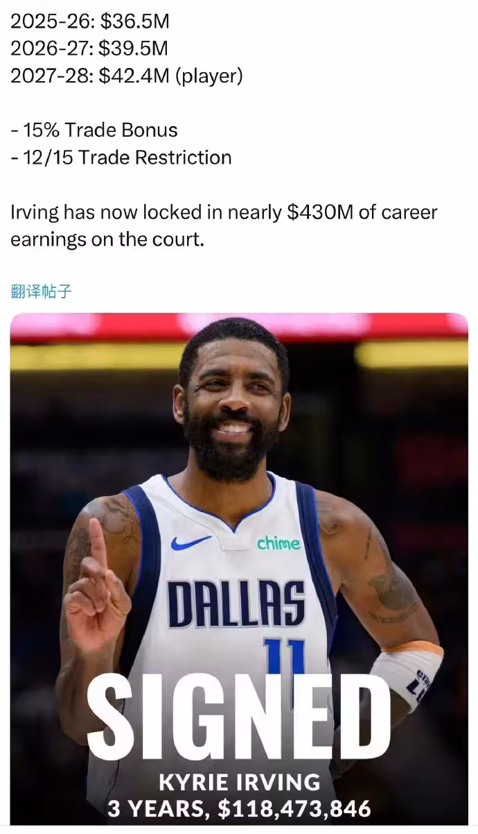 上賽季,歐文出戰50場常規賽,場均上陣36.1分鐘,貢獻24.7分4.8板4.6助1.3斷,三項命中率47.3%、40.1%和91.6%,今夏休賽期以三年1.19億美元續約獨行俠,27-28賽季球員選項。