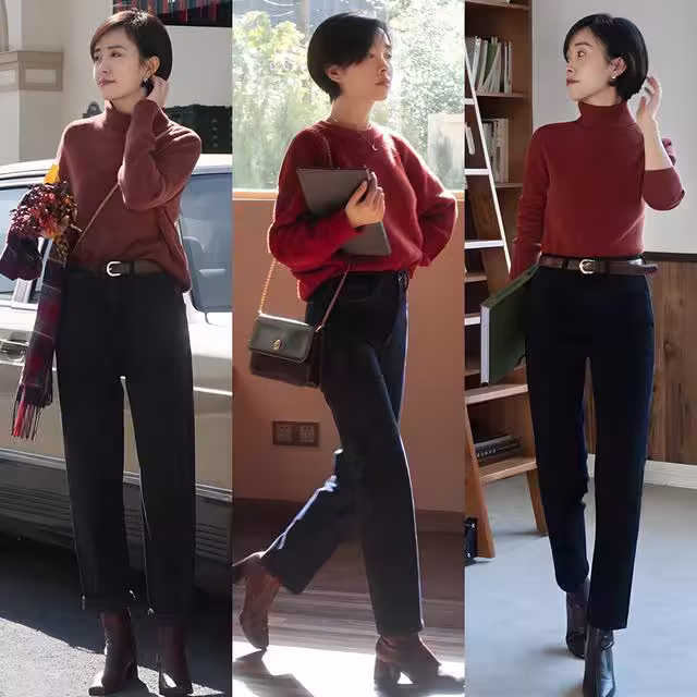 九分煙管褲+皮革腰帶,就能輕鬆提升精緻感,再搭配一雙低跟踝靴,顯瘦顯腿長,真的超級適合中年女人借鑑。