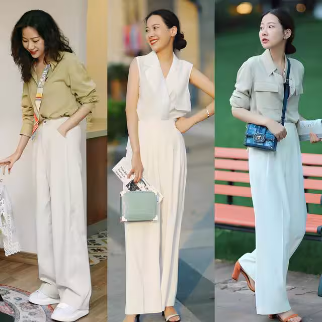 長褲的搭配,想要營造出呼吸感,關鍵就是「露膚度」。我們在穿衣搭配的時候,建議可以將重心轉移至上半身,選擇低領款式的上衣,或者將紐扣解開穿,露出鎖骨和頸部線條,吸引力拉滿。