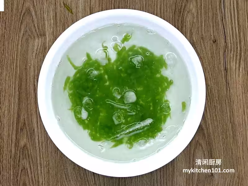 1 把所有煎蕊條材料混合拌勻,然後過濾入小鍋里。提前準備好一大碗冰水。以中火煮至完全呈半透明狀。趁熱用矽膠刮刀(silicone spatula)把煮好的粉糊壓過有洞的大漏勺入冰水裡。(詳細做法請參考:如何製作煎蕊Cendol條)