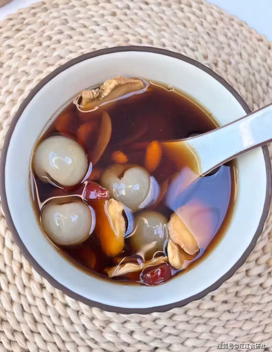 現在我煮得可溜了:5 顆帶殼桂圓(挑的時候捏著有彈性、聞著有甜香的才好)敲裂,加 3 顆桑葚干、1 塊泡軟的茯苓,冷水下鍋小火煮 20 分鐘,煮到湯能掛在勺子上就差不多了,最後撒把玫瑰燜 3 分鐘。