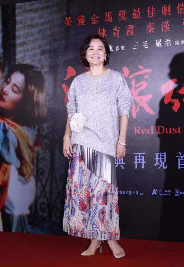 對了上了年紀的女人來說,發福是基本逃不過的情況,而衛衣的材質又普遍硬,穿在發福的身材上,即使你只有120斤,也會看著像150斤。如下圖中的林青霞,穿著淺紫色的衛衣,就好胖的感覺,顯得頭小身體大。