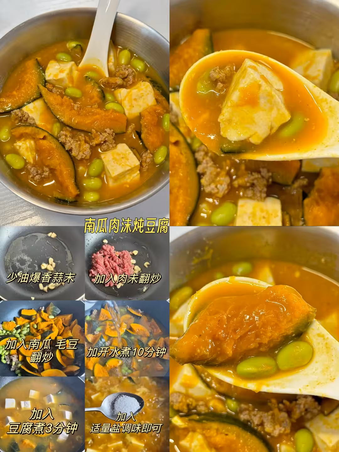 ✅第二款:南瓜肉末燉豆腐 準備食材:南瓜、豆腐、毛豆、蒜末 配料:食鹽