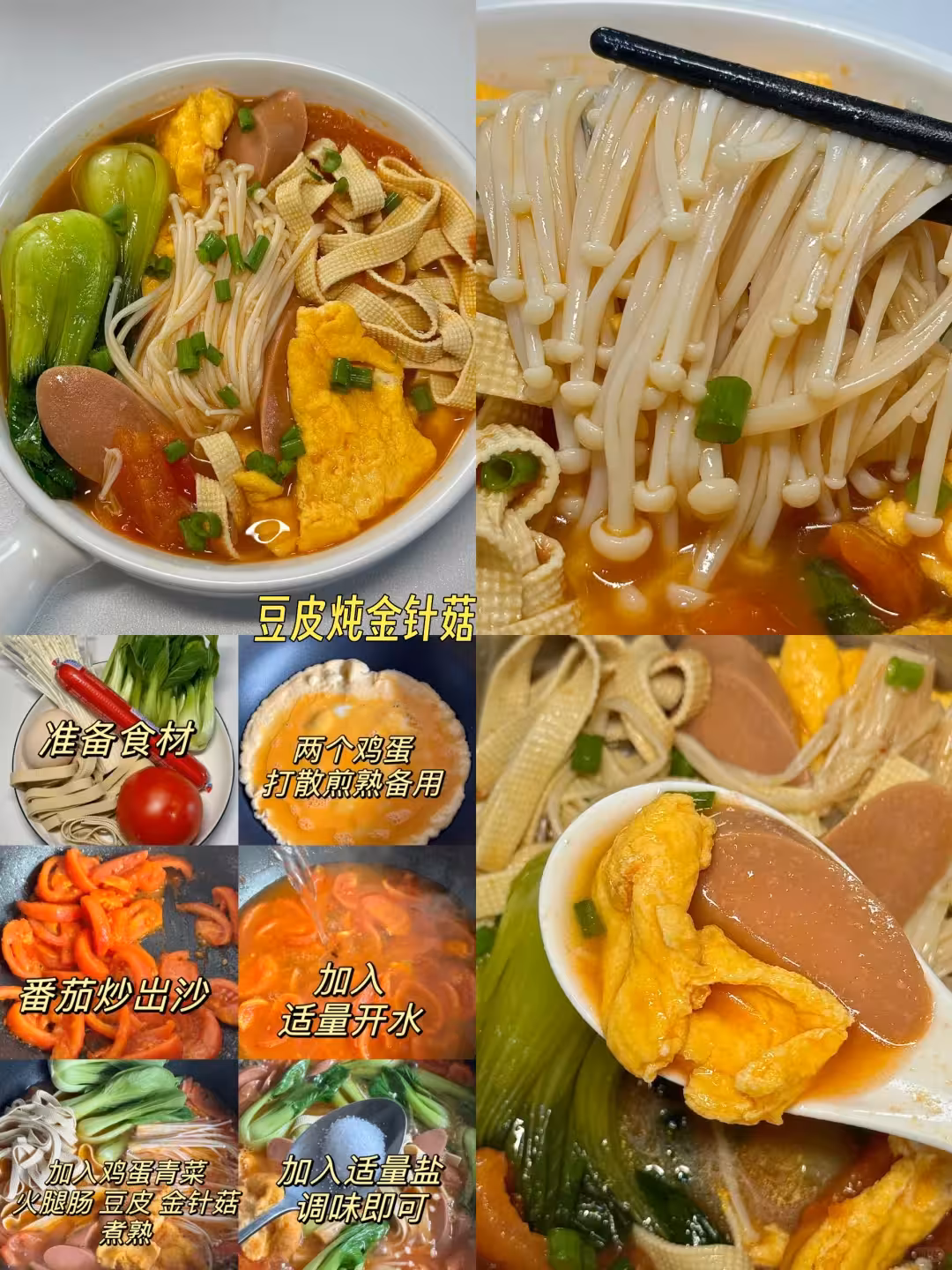 ✅第八款:豆皮燉金針菇 準備食材:金針菇、豆皮、雞蛋、豆皮、番茄、火腿、青菜、蔥花 配料:食鹽、胡椒粉